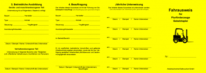 Die Deutsche Gesetzliche Unfallversicherung (DGUV) schreibt eine bundesweit einheitliche und verpflichtende Prüfung für das Fahren von Flurförderzeugen vor. Die Ausbildung erfolgt nach den berufsgenossenschaftlichen Grund-sätzen bei Ihnen im Betrieb und auf Ihrem Gerät.